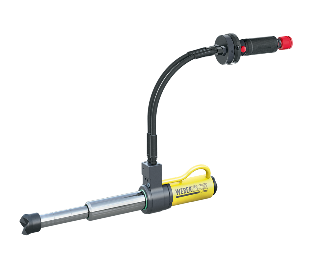 This compact rescue ram is designed for tight spaces like vehicle footwells. It extends smoothly to 600 mm and features an integrated remote control/handle for easy operation. The innovative DISTANCE feature on the piston rod clearly shows the remaining extension length.