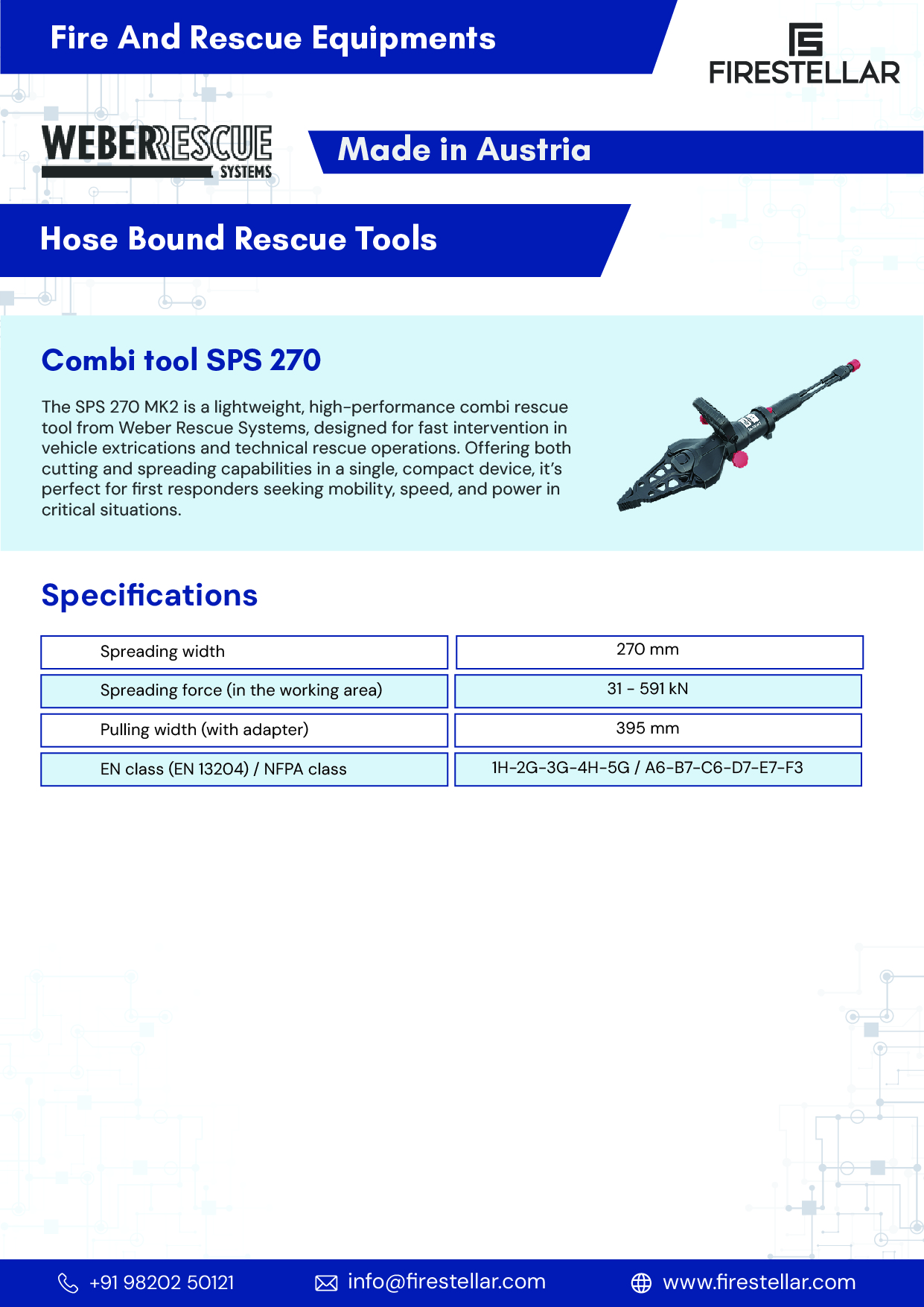 The SPS 270 MK2 is a lightweight, high-performance combi rescue tool from Weber Rescue Systems, designed for fast intervention in vehicle extrications and technical rescue operations. Offering both cutting and spreading capabilities in a single, compact device, it’s perfect for first responders seeking mobility, speed, and power in critical situations.