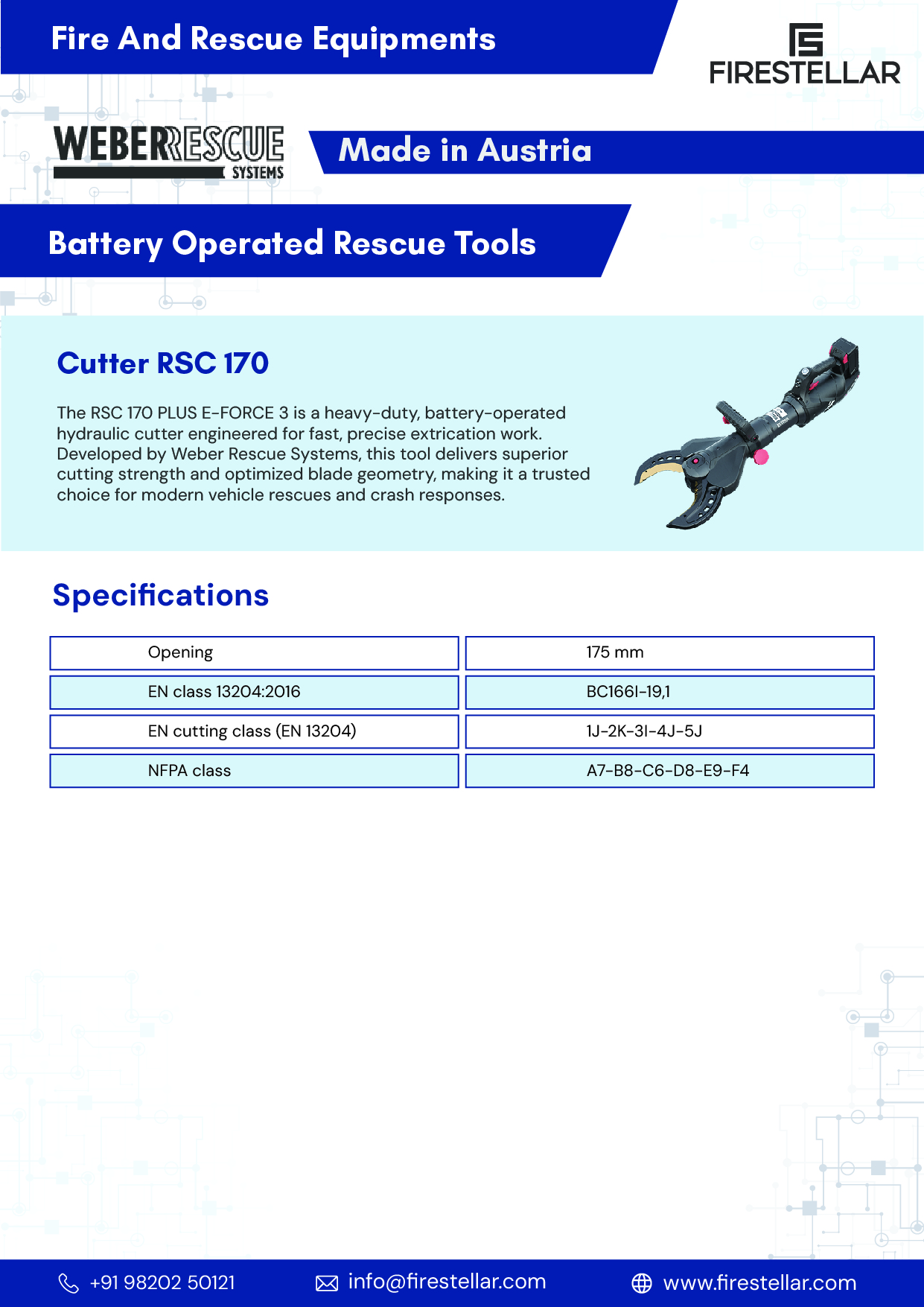 The RSC 170 PLUS E-FORCE 3 is a heavy-duty, battery-operated hydraulic cutter engineered for fast, precise extrication work. Developed by Weber Rescue Systems, this tool delivers superior cutting strength and optimized blade geometry, making it a trusted choice for modern vehicle rescues and crash responses.
