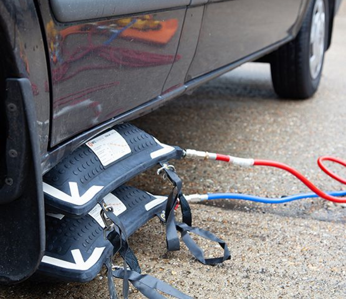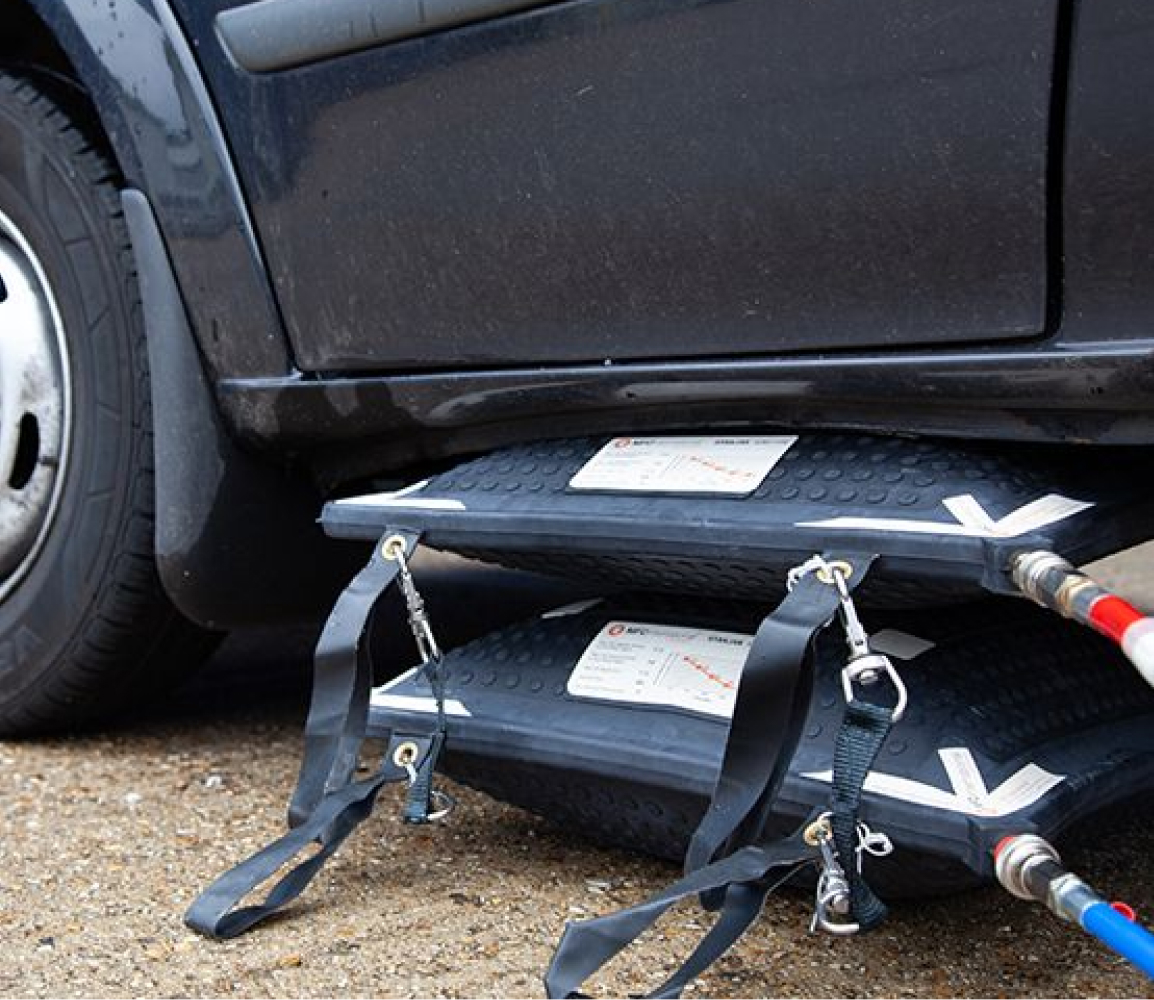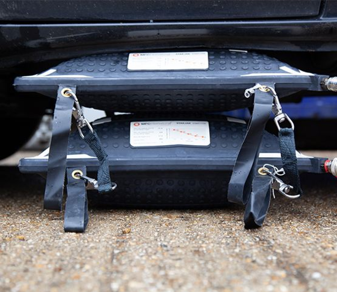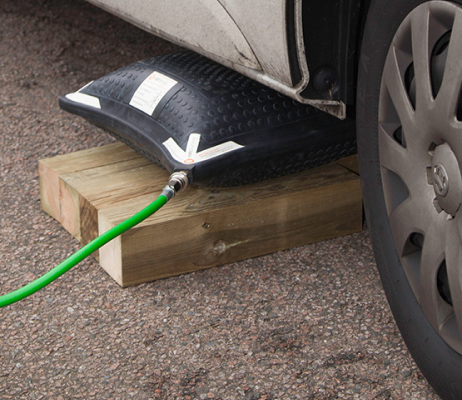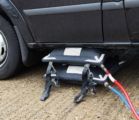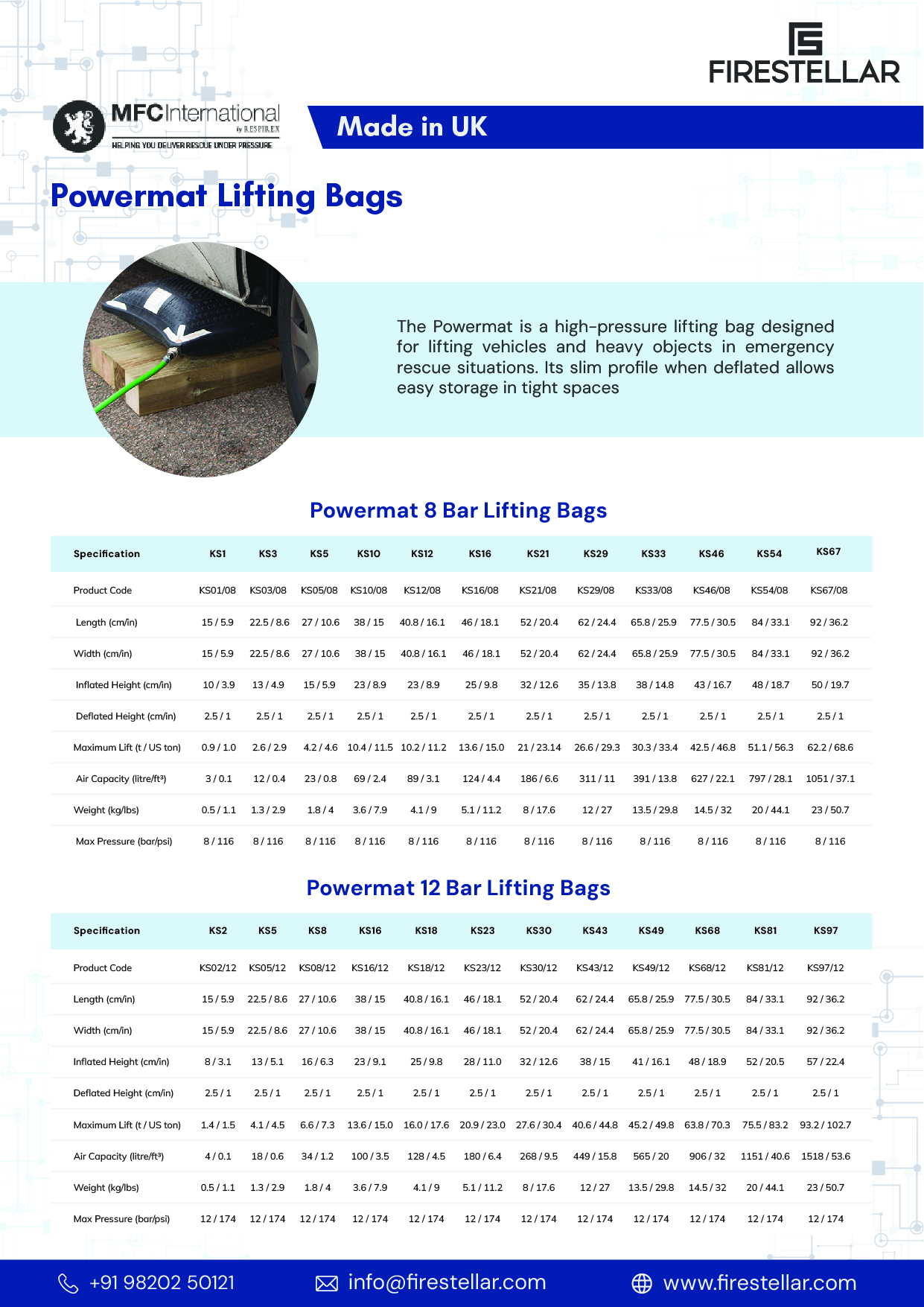 The Powermat is a high-pressure lifting bag designed for lifting vehicles and heavy objects in emergency rescue situations. Its slim profile when deflated allows easy storage in tight spaces. Available in 13 sizes, Powermats lift from 1 tonne to 68 tonnes, and up to 93 tonnes for 12 bar bags. They inflate quickly and can be powered by BA cylinders, SCUBA tanks, compressors, factory airlines, or vehicle air brake systems. While primarily for emergency rescue, they are also used in urban search and rescue, industrial, mining, railroad, and military applications.