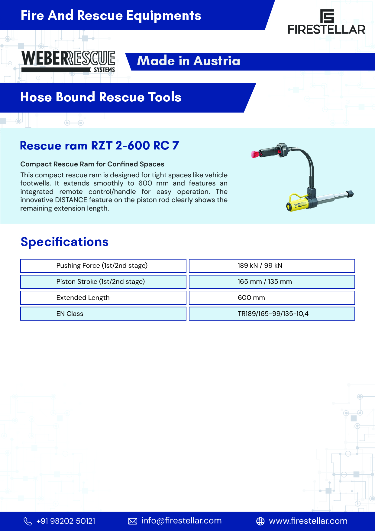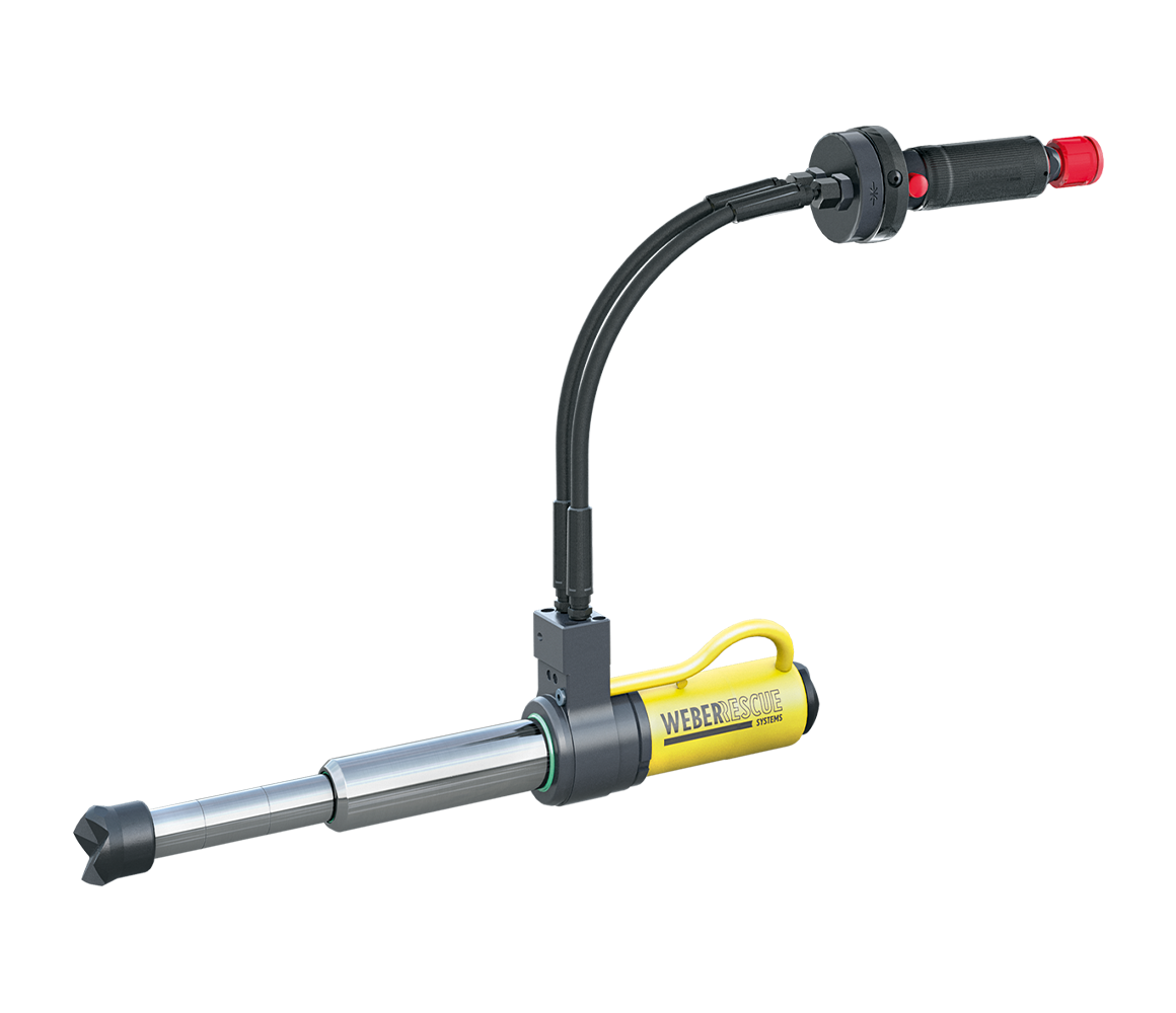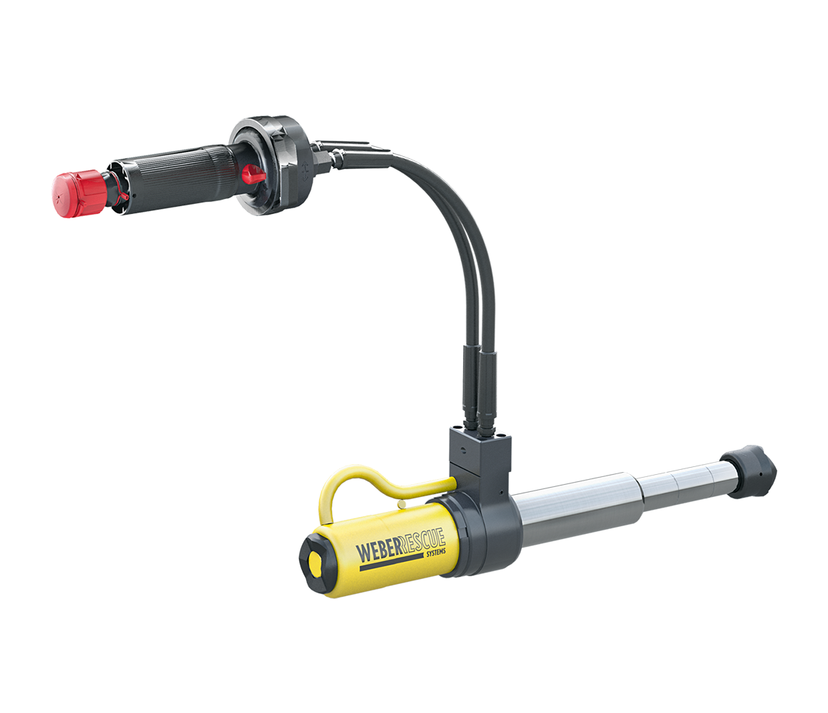 This compact rescue ram is designed for tight spaces like vehicle footwells. It extends smoothly to 600 mm and features an integrated remote control/handle for easy operation. The innovative DISTANCE feature on the piston rod clearly shows the remaining extension length.