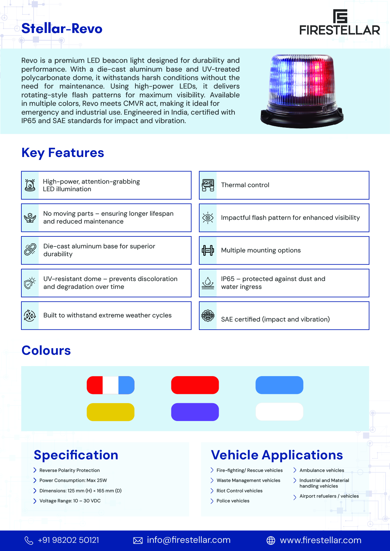 Revo is a premium LED beacon light designed for durability and performance. With a die-cast aluminum base and UV-treated polycarbonate dome, it withstands harsh conditions without the need for maintenance. Using high-power LEDs, it delivers rotating-style flash patterns for maximum visibility. Available in multiple colors, Revo meets CMVR act, making it ideal for emergency and industrial use. Engineered in India, certified with IP65 and SAE standards for impact and vibration.