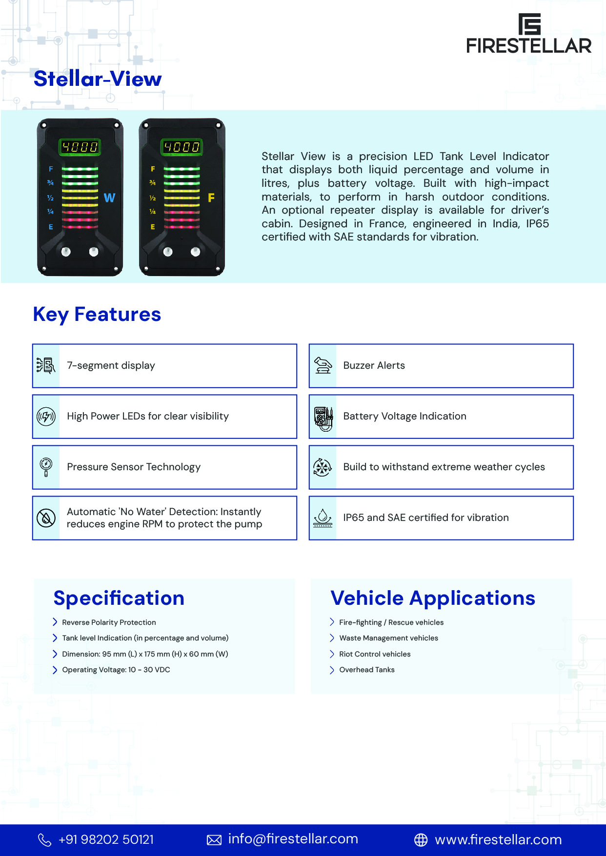 Stellar View is a precision LED Tank Level Indicator that displays both liquid percentage and volume in litres, plus battery voltage. Built with high-impact materials, to perform in harsh outdoor conditions. An optional repeater display is available for driver’s cabin. Designed in France, engineered in India, IP65 certified with SAE standards for vibration.